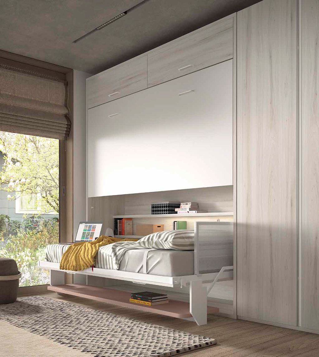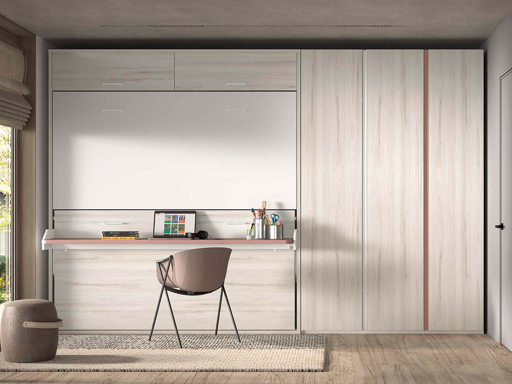 Cama litera doble abatible horizontal con altillo con encimera sincronizada