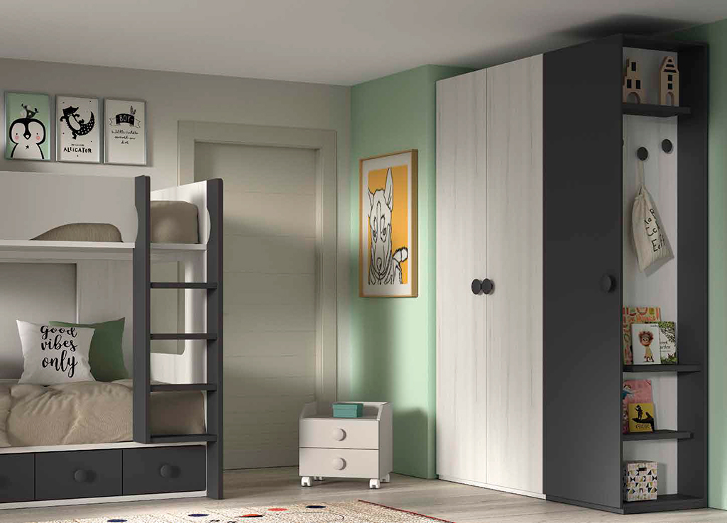 Cama litera bicolor con modulo 4 cajones de gran capacidad, quitamiedos y escalera incluida, con 20 colores para poder combinar