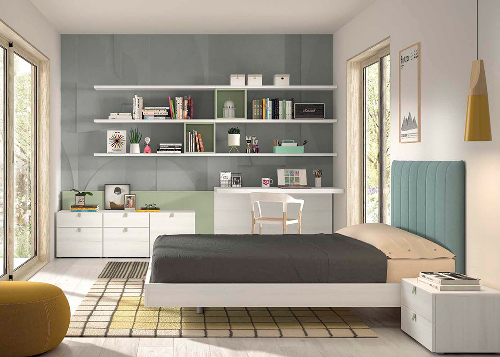Composicion juvenil junior cabecero tapizado , con bañera volada y mesilla cama de 135cm , 20 colores para poder combinar y tapizados para cabecero
