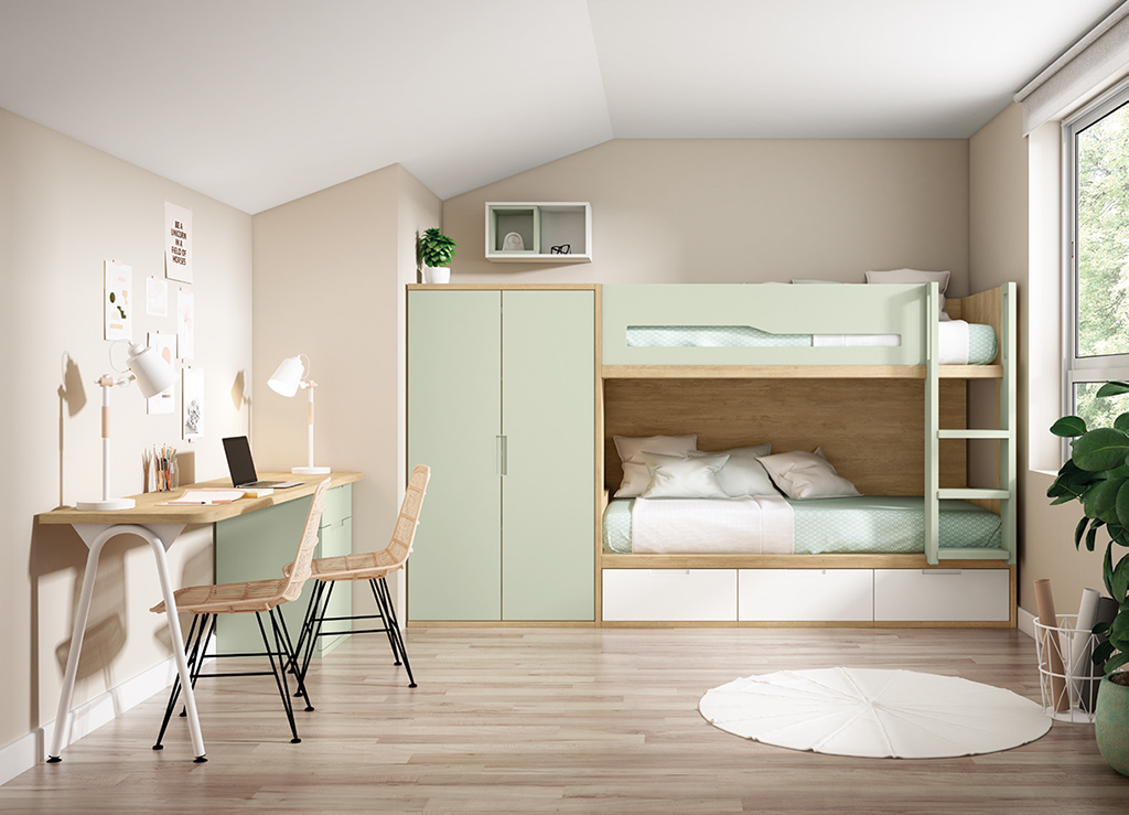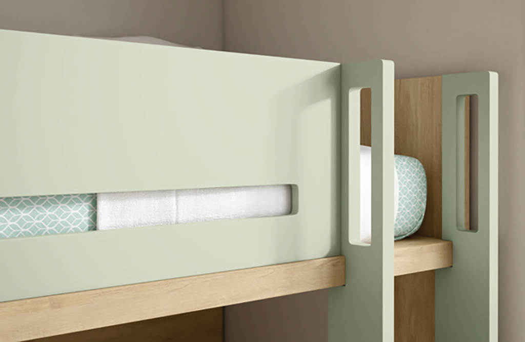 Litera con 2 camas con bases reforzadas, cojones de gran capacidad, escalera y quitamiedos lacado